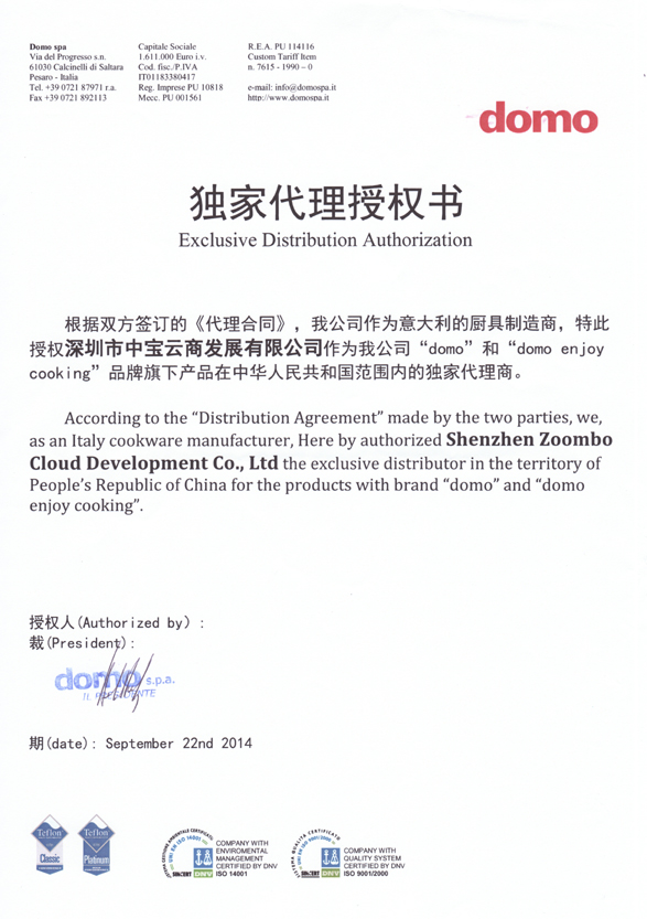 2014年9月,廣東中寶炊具制品有限公司全資子公司——深圳市中寶云商發(fā)展有限公司,正式成為意大利知名廚具品牌“domo”、“domo enjoy cooking”的中國(guó)獨(dú)家代理商。